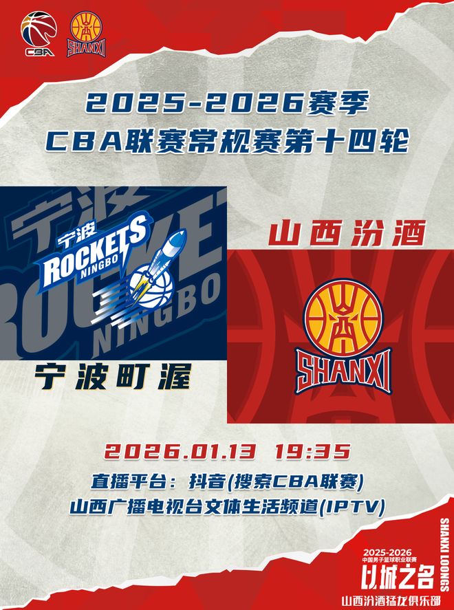 北京時(shí)間2026年1月13日19:35,2025-2026賽季CBA聯(lián)賽常規(guī)賽第14輪繼續(xù)進(jìn)行,山西汾酒客場挑戰(zhàn)寧波町渥,球迷觀眾可以通過抖音(搜索CBA聯(lián)賽)、山西廣播電視臺文體生活頻道(IPTV)觀看比賽實(shí)況,在屏幕前與我們一起為山西汾酒男籃加油助威!