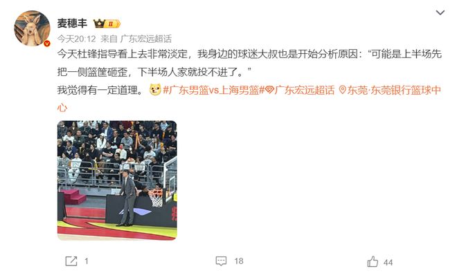 廣東媒體人麥穗豐都已經(jīng)輸?shù)秸{(diào)侃主隊(duì)了:杜鋒看上去非常淡定,我身邊的大叔開始分析原因‘上半場先把籃筐砸歪,下半場上海就投不進(jìn)了’,我覺得有一定的道理。