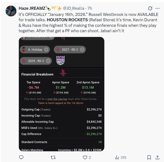 還有火箭球迷甚至建議用霍勒迪、2個(gè)次輪簽送到國(guó)王換拉塞爾-威斯布魯克,讓威少與 杜蘭特在休斯頓重聚。
