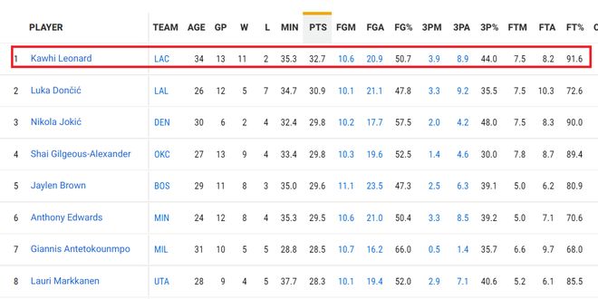 在快船打出12勝2負(fù)期間,小卡打了13場比賽,戰(zhàn)績11勝2負(fù)。小卡在這段時(shí)間里場均得到32.7分6.9籃板3.8助攻2.6搶斷1.0蓋帽,這完全是攻防一體的表現(xiàn)。值得一提的是,小卡的場均得分力壓這段時(shí)間場均得到30.9分的東契奇排名第一。