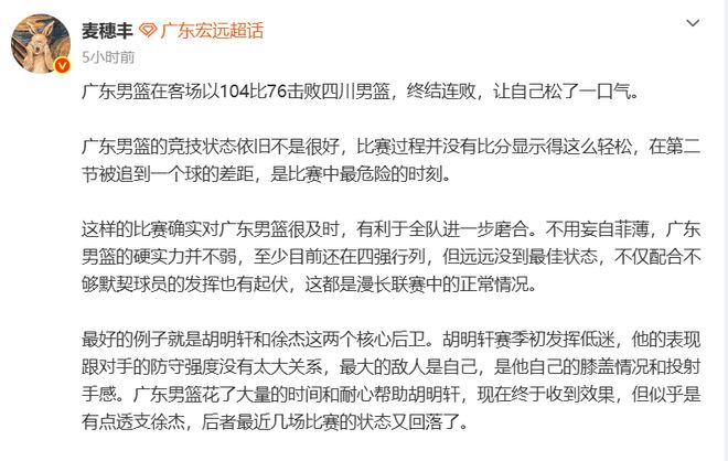 不妨先來看看媒體人麥穗豐的個人見解,麥老師依舊認為廣東隊的競技狀態(tài)不是很好,比賽過程并沒有比分顯示得這么輕松,廣東男籃的硬實力并不弱,至少目前還在四強行列,但遠遠沒到最佳狀態(tài),不僅配合不夠默契球員的發(fā)揮也有起伏,這都是漫長聯(lián)賽中的正常情況。