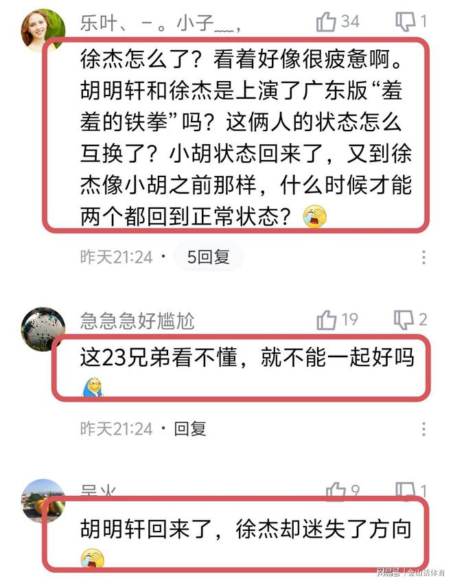 徐杰近幾場(chǎng)比賽,持續(xù)低迷的表現(xiàn),以及與胡明軒“靈魂互換”的現(xiàn)象,也讓許多廣東球迷非常著急,紛紛在網(wǎng)絡(luò)上留言“胡明軒好不容易好起來(lái),卻換到徐杰低迷了?!?;“我看到杰師傅眼神都是迷離的,估計(jì)真的太累,也就休息了一場(chǎng),機(jī)器人都受不了?!?;“徐杰怎么了?看著好像很疲憊啊。胡明軒和徐杰是上演了廣東版“羞羞的鐵拳”嗎?這倆人的狀態(tài)怎么互換了?小胡狀態(tài)回來(lái)了,又到徐杰像小胡之前那樣,什么時(shí)候才能兩個(gè)都回到正常狀態(tài)?”;“這23兄弟看不懂,就不能一起好嗎”;“胡明軒回來(lái)了,徐杰卻迷失了方向”……