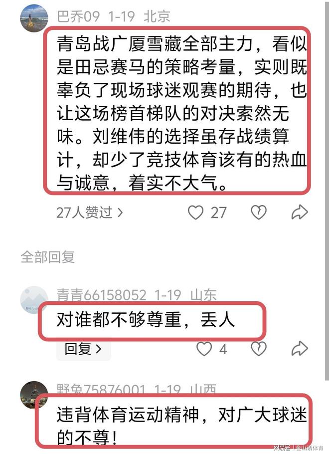 青島隊(duì)在央視直播的比賽中,“下架”4大主力,也讓廣大網(wǎng)友非常氣憤,紛紛吐槽道:“劉維偉直接輪休4個絕對主力,太不像話了,體育的意義在哪里?體育的精神在哪里?”;“青島戰(zhàn)廣廈雪藏全部主力,看似是田忌賽馬的策略考量,實(shí)則既辜負(fù)了現(xiàn)場球迷觀賽的期待,也讓這場榜首梯隊(duì)的對決索然無味。劉維偉的選擇雖存戰(zhàn)績算計,卻少了競技體育該有的熱血與誠意,著實(shí)不大氣?!?;“對誰都不夠尊重,丟人”;“違背體育運(yùn)動精神,對廣大球迷的不尊!”;“直接繳槍,籃協(xié)應(yīng)該有態(tài)度。……