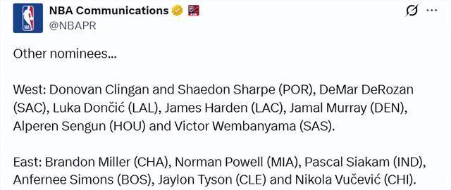 西部:克林根和夏普(開拓者)、德羅贊(國(guó)王)、東契奇(湖人)、哈登(快船)、穆雷(掘金)、申京(火箭)、文班亞馬(馬刺)
