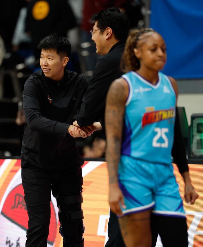 1月20日,廣東東莞新彤盛隊(duì)主教練兼球員黃思靜(左一)與球員兼助理教練楊力維(左二)等上場(chǎng)球員致意。新華社記者 王麗莉 攝