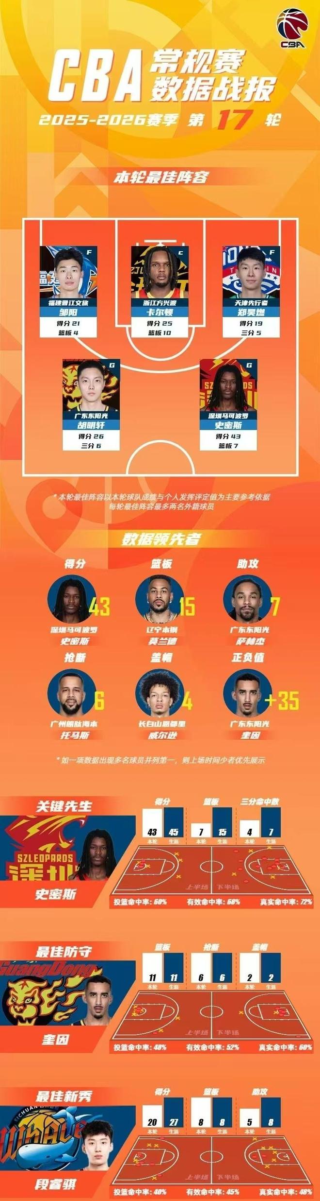 CBA官宣常規(guī)賽第17輪最佳陣容,廣東核心胡明軒26+6三分賽季最佳一戰(zhàn)領(lǐng)銜入選,還有深圳外援史密斯43+7貢獻(xiàn)關(guān)鍵壓哨反絕殺三分,外加鄒陽(yáng)、卡爾頓、鄭昊燃也入選。