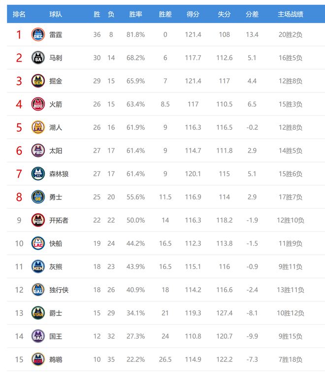 今日比賽后火箭、湖人、太陽、森林狼排名互換,其他西部球隊排名不變。