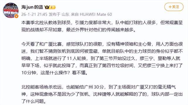 媒體人海jun的藍就發(fā)文談到了北控男籃——