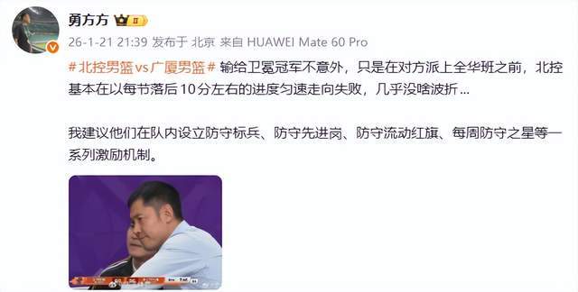 來自北京BTV的記者勇方方老師更是表示,“輸給衛(wèi)冕冠軍不意外,只是在對方派上全華班之前,北控基本在以每節(jié)落后10分左右的進度勻速走向失敗,幾乎沒啥波折...我建議他們在隊內(nèi)設(shè)立防守標(biāo)兵、防守先進崗、防守流動紅旗、每周防守之星等一系列激勵機制?!?/strong>