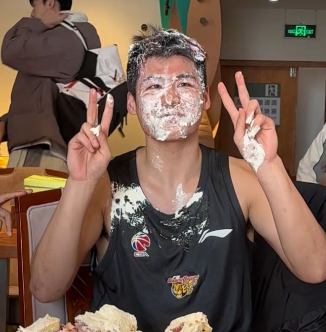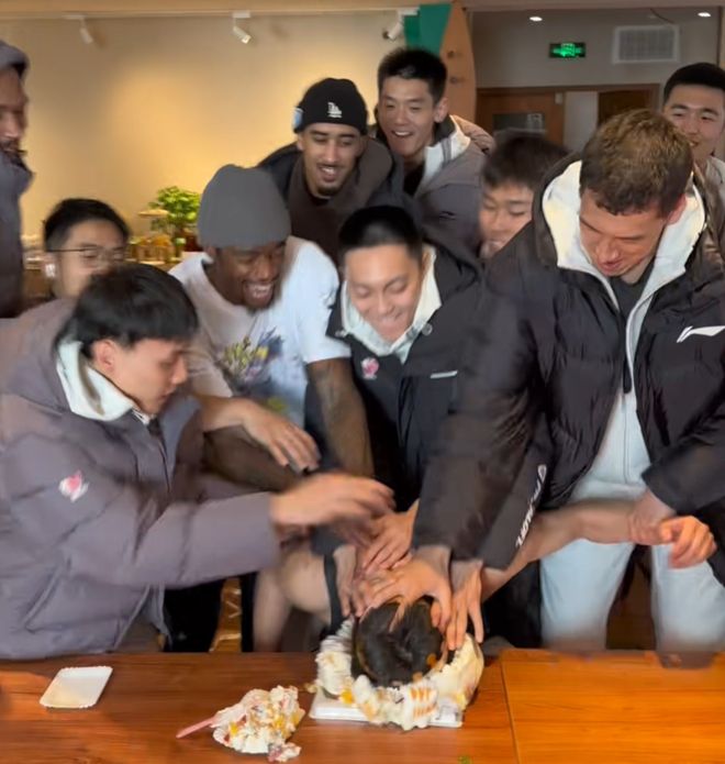 準(zhǔn)備工作做完后,主力的人員還是胡明軒、徐杰、薩姆納和杜潤旺,他們狠狠將陳家政摁在蛋糕上。這個(gè)時(shí)候徐杰慢了一點(diǎn),他當(dāng)時(shí)還在品嘗蛋糕呢,隊(duì)友就下手了,最后才匆匆上手。