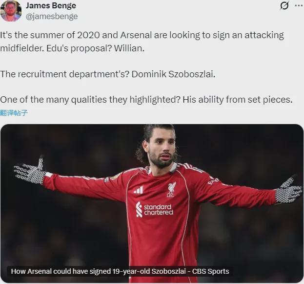 CBS記者JB消息,在索博斯洛伊加盟利物浦之前的5年時(shí)間里,阿森納一直在密切關(guān)注他,槍手的球探部門極力推薦這名中場(chǎng),球員本人也對(duì)轉(zhuǎn)會(huì)很感興趣。
