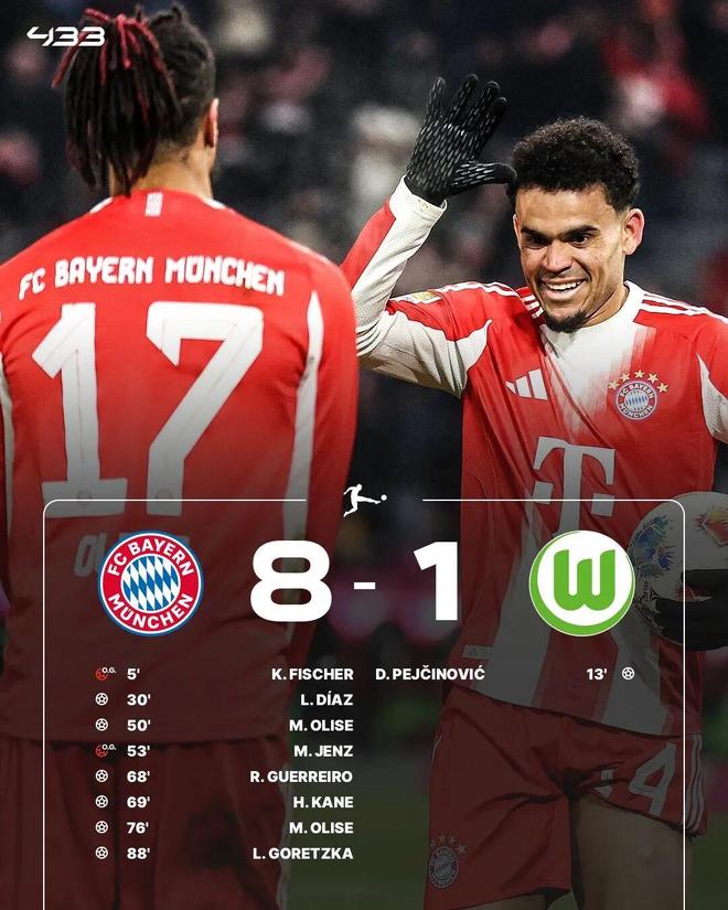 迪亞斯、延茨、格雷羅、凱恩、格雷茨卡先后破門,奧利塞梅開二度,最終,拜仁在主場8-1大勝沃爾夫斯堡,繼續(xù)領跑德甲積分榜。
