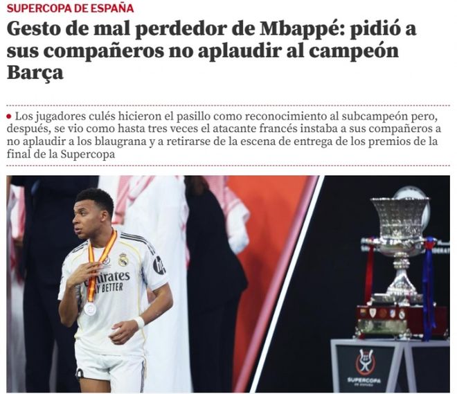 巴薩3-2皇馬實現(xiàn)衛(wèi)冕。賽后,據(jù)《世界體育報》的報道稱,姆巴佩在賽后做出了一些不太友好的舉動。