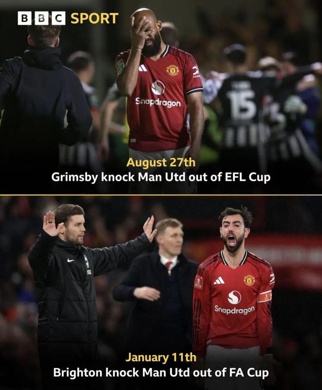 本賽季英聯(lián)杯第二輪,曼聯(lián)在點球大戰(zhàn)中被英乙球隊格林斯比淘汰。如今,曼聯(lián)在足總杯第三輪被布萊頓淘汰。