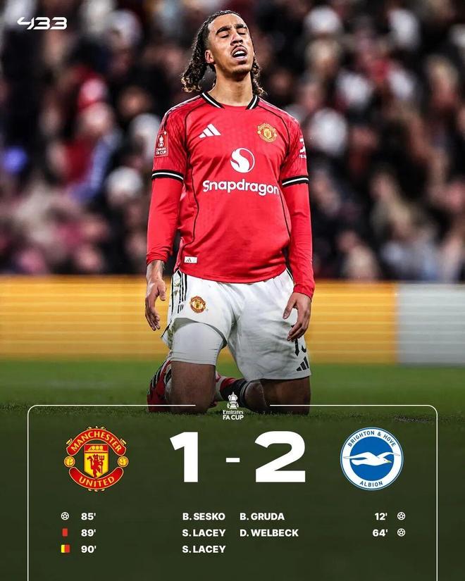 易邊再戰(zhàn),維爾貝克爆射破門,布萊頓在客場2球領先,隨后,B費角球助攻,謝什科頭球破門。比賽的尾聲階段,曼聯(lián)小將萊西不滿判罰砸球發(fā)泄,裁判出示第二張黃牌將其罰下。最終,曼聯(lián)在主場1-2不敵布萊頓,慘遭淘汰。