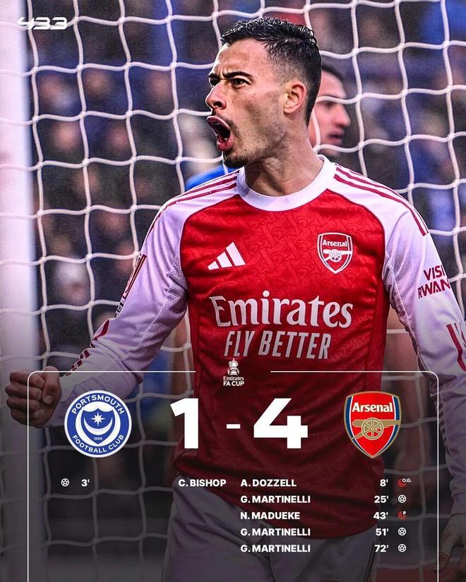 不過,槍手并沒有自亂陣腳,憑借角球得分的優(yōu)勢,先后取得破門,半場2-1反超比分。易邊再戰(zhàn),馬丁內利完場帽子戲法,最終,槍手客場4-1逆轉擊敗樸茨茅斯,晉級足總杯下一輪。
