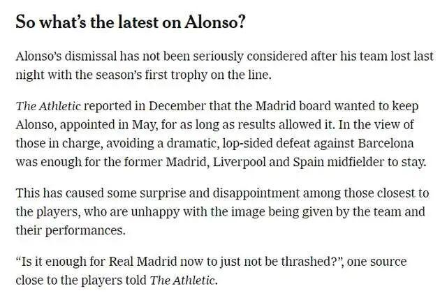 第二是歐冠連遭重創(chuàng)。在歐冠賽場(chǎng),皇馬先后以0-1負(fù)于當(dāng)時(shí)在英超掙扎的利物浦,又在主場(chǎng)領(lǐng)先的情況下被曼城2-1逆轉(zhuǎn)。對(duì)陣曼城賽后,媒體普遍認(rèn)為阿隆索的 “未來似乎已經(jīng)看到了盡頭的”。