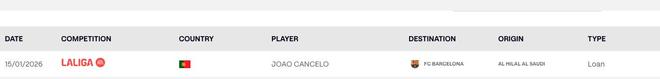 當?shù)貢r間1月15日,西甲官網(wǎng)顯示,巴薩已為坎塞洛在西甲完成注冊。