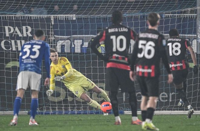 第25分鐘,科莫踢出犀利的反擊。尼科-帕斯在禁區(qū)前沿起腳遠(yuǎn)射。門將邁尼昂做出極限撲救,化解了險(xiǎn)情。第41分鐘,達(dá)庫尼亞門前搶點(diǎn)頭球攻門。邁尼昂再次做出神撲。真是不可思議。屢失良機(jī)的科莫隨后遭到懲罰。拉比奧制造點(diǎn)球機(jī)會。恩昆庫主罰,穩(wěn)穩(wěn)命中。半場結(jié)束,AC米蘭1-1科莫。