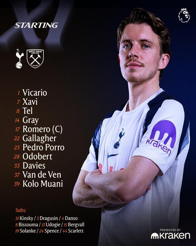 托特納姆熱刺首發(fā):1-維卡里奧、23-波羅、33-本-戴維斯、37-范德芬、17-克里斯蒂安-羅梅羅、14-阿奇-格雷、22-加拉格爾、7-哈維-西蒙斯、11-馬蒂斯-特爾、28-奧多貝爾、39-穆阿尼