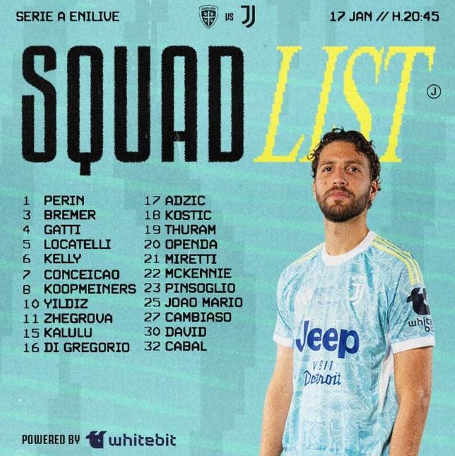 1月17日,尤文圖斯公布了明天凌晨客戰(zhàn)卡利亞里的大名單,洛卡特利領(lǐng)銜,喬納森-戴維出戰(zhàn),米利克繼續(xù)傷缺。