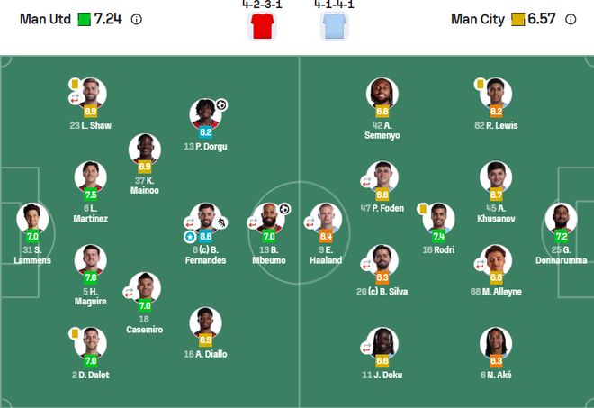 第一陣型回歸傳統(tǒng),強(qiáng)調(diào)寬度與防守??ɡ锟斯麛喾艞壛税⒛制珢?ài)的三中衛(wèi)體系(3-4-2-1),回歸曼聯(lián)更為熟悉的4-2-3-1陣型。這一改變迅速穩(wěn)定了防守,兩個(gè)邊后衛(wèi)的職責(zé)變得明確,同時(shí)也釋放了邊鋒阿馬德和邊后衛(wèi)多爾古的進(jìn)攻天賦。
