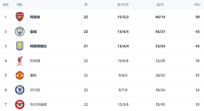 在積分榜上,阿森納15勝5平2負的戰(zhàn)績,拿到50分,排名榜首位置。曼城連續(xù)4輪不勝,丟掉了太多分數(shù),總積分只有43分,屈居第2名,落后了7分。阿斯頓維拉在少賽一場的情況下也是43分,暫時排名第3。利物浦以36分排名第4。曼聯(lián)總積分達到35分,排名第5,只比利物浦少1分。切爾西34分排名第6。