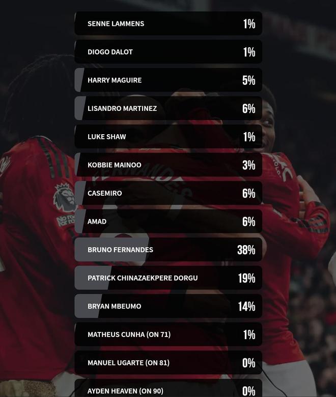 賽后,在曼聯(lián)官網(wǎng)發(fā)起的投票中,B費獲得了38%球迷的投票,當選隊內(nèi)最佳,表現(xiàn)同樣出色的多古、姆伯莫分別獲得了19%、14%的投票。