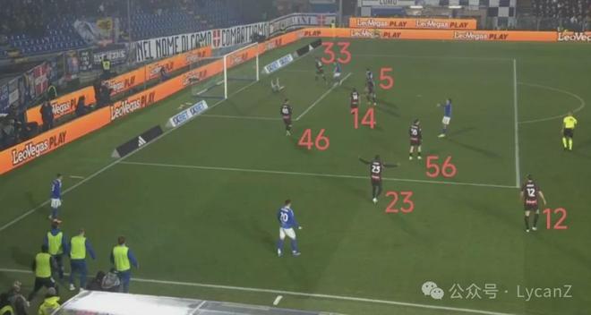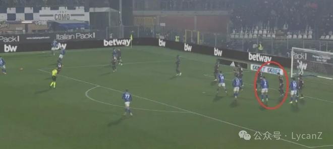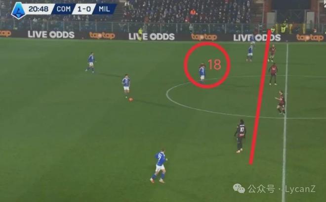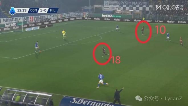 科莫一記斜傳打向米蘭的左路,靠著鋒線兩點(diǎn)壓制米蘭后衛(wèi),右后衛(wèi)范德布雷普特拿球長驅(qū)直入暢通無阻并輕松起腳,萊奧換位在左路卻沒有起到相應(yīng)的防守作用。直到第55分鐘米蘭2:1完成反超,陣型全面后撤收縮后,米蘭10號才真正開始防守。