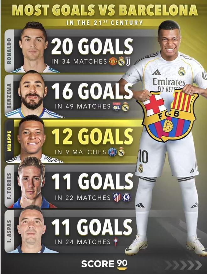 這份“21世紀對巴薩進球榜”最直觀的畫面,就是皇馬的人長期站在前排:C羅34場20球,場均0.59;本澤馬49場16球,場均0.33;姆巴佩9場12球,場均1.33。榜單里也有托雷斯22場11球(0.50)、阿斯帕斯24場11球(0.46)這樣的名字,但把榜單的主軸撐起來的,還是皇馬這條線。