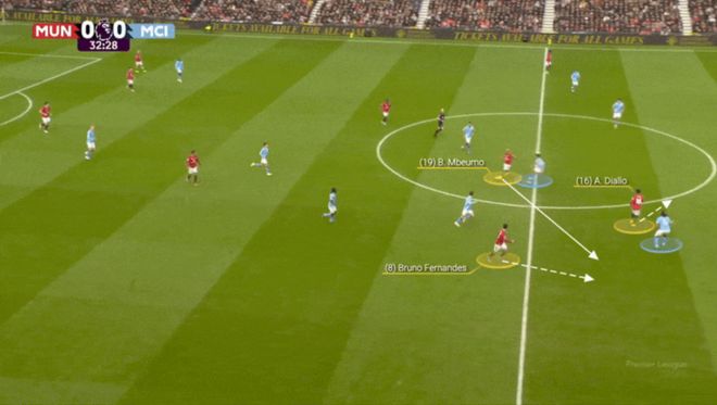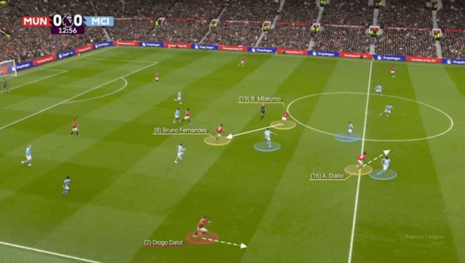在進(jìn)攻端,卡里克和教練組安排的無鋒陣容,通過不斷的換位跑動(dòng),利用曼城中場(chǎng)和后衛(wèi)身后的區(qū)域。站在中鋒位置的姆貝莫回撤,B費(fèi)、阿馬德·迪亞洛 、帕特里克·多古甚至邊衛(wèi)迪奧古·達(dá)洛系統(tǒng)的跑位,不斷制造出空當(dāng)。